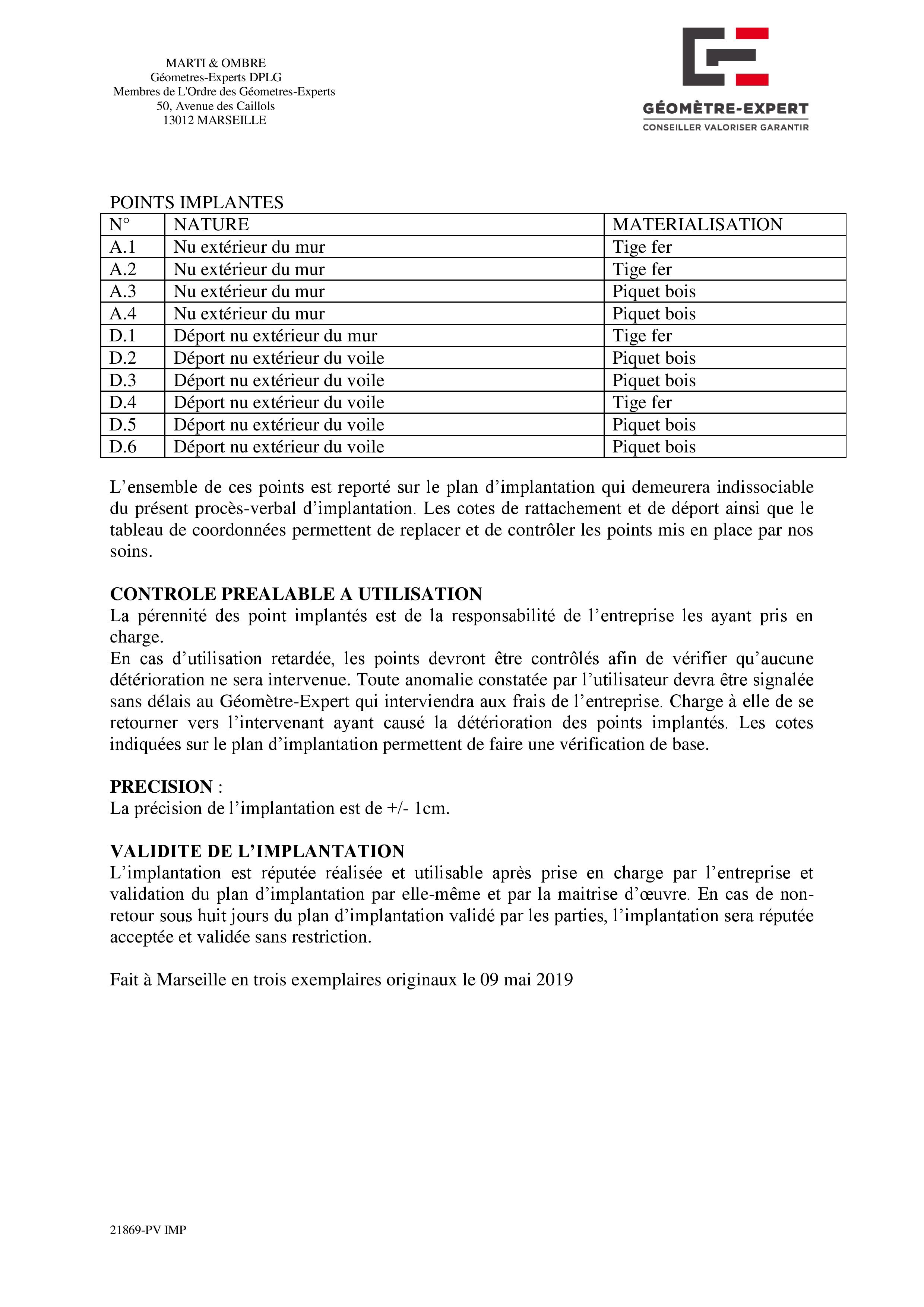 L’implantation sera finalisée par la rédaction d’un procès-verbal d’implantation avec plan annexé.